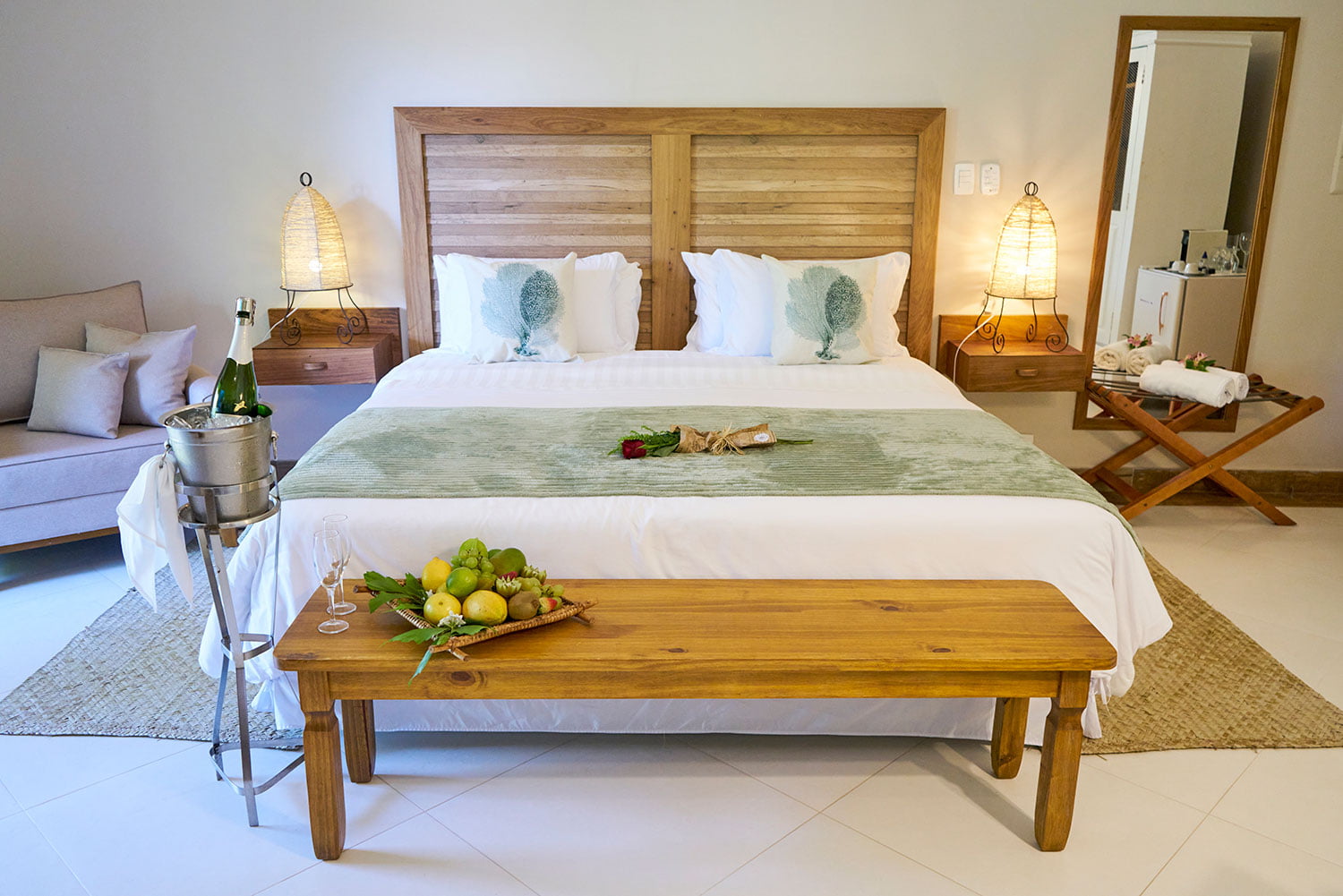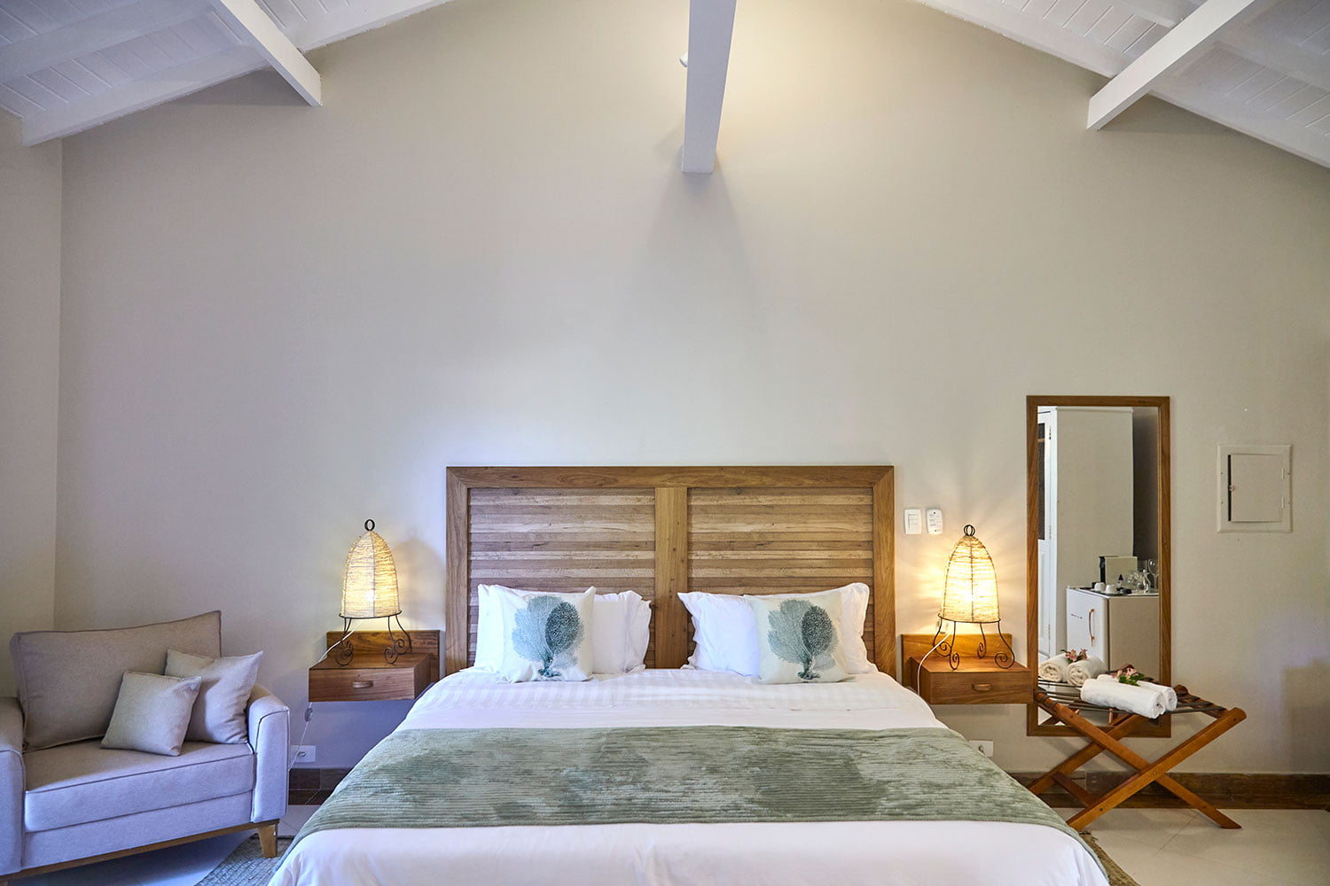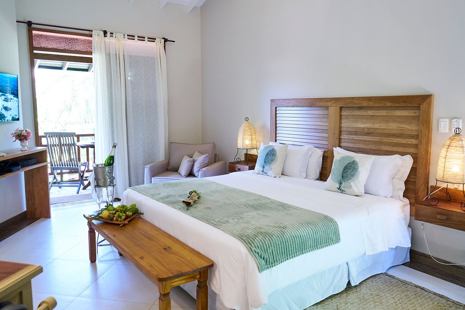 Suítes com 40 m²,terraço com cadeiras e mesa, decoração personalizada, ar condicionado split, frigobar, SmartTV 42″ com canais Vivo fibra, Wi-Fi, secador, cofre, cama King Size e máquina de Nespresso. No banheiro, a água do chuveiro é aquecida através de equipamento individual a gás.